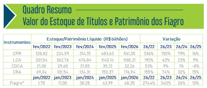 Vale mencionar que, desse estoque de LCA, no mínimo 60% do valor deve obrigatoriamente ser reaplicado pelas instituições financeiras emissoras no financiamento rural. Em fevereiro, o valor total a ser reaplicado chegou a R$ 352 bilhões, indicando aumento significativo de 31% em comparação ao verificado no mesmo período de 2025.